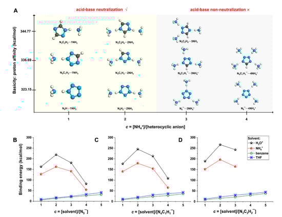 Taking the solvent NH4+ as an example, Figure 3A presents the optimized structures of the N3C2H2¯⋯cNH4+, N4C1H1¯⋯cNH4+, and N5¯⋯cNH4+ complexes. When c < 3, the NH4+ ions turned to be neutral NH3 molecules after the reaction, and the heterocyclic anions were protonated. That is, acid and base underwent a neutralization process. Correspondingly, the BE values of the three heterocyclic complexes all increased to the maximum when the NH4+ concentration increased from c = 1 to c = 2, as shown in Figure 3B–D. However, when c ≥ 3, the proton would stay near NH4+, and the heterocyclic anions tended to remain unprotonated, as shown by the interaction strengths (distances) of the proton with the heterocyclic anion and with solvent species in Figures S5 and S6 of the Supplementary Materials. Namely, acid and base would not proceed neutralization. Besides, the BE value of the complex started to decrease with a further increase in c, as shown in Figure 3B–D.