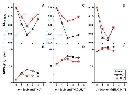 DImin-σ(LP) and NICSzz(1)σ of (A,B) N5¯, (C,D) N4C1H1¯, and (E,F) N3C2H2¯ with increasing concentration of H3O+ and NH4+.