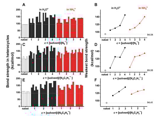 All bond strengths and weakest bond strengths in the rings of (A,B) N5¯, (C,D) N4C1H1¯, and (E,F) N3C2H2¯ in variant H3O+/NH4+ concentration. The weakest bond strength in the ring of each naked heterocyclic anion is marked by a dashed line for comparison.