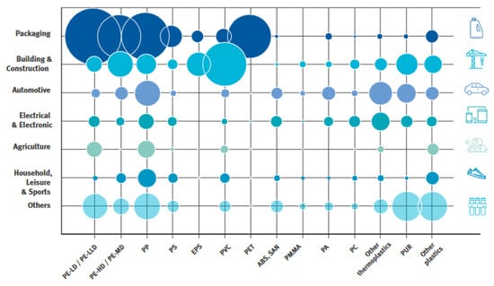 Plastic demand by domain and type of polymer in 2019. Illustration taken from report “Plastics—the Facts 2020”. Source: PlasticsEurope []. Polyethylene—PE (LLD: linear low-density; MD: medium-density), polypropylene—PP, polystyrene—PS, polyvinyl chloride—PVC, polyethylene terephthalate—PET, acrylonitrile butadiene styrene—ABS, styrene acrylonitrile—SAN, poly(methyl methacrylate)—PMMA, polyamide—PA, polycarbonates—PC, polyurethane—PUR.