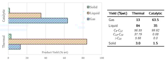 Product yield comparison between thermal and catalytic pyrolysis of HDPE. Graph adapted from Seo et al. data [].