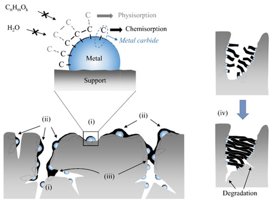 Deactivation via coke formation is a complex phenomenon combining successive physical and chemical interactions. In catalytic processes involving hydrocarbon feedstock, coke formation usually starts with strong chemisorption as a monolayer of coke precursor or physisorption in multilayers over active sites. As illustrated in Figure 8, this results in a partial hindering of active sites (i). As carbonaceous compounds accumulate, other deactivating phenomena can occur: total encapsulation of the active site, making it inaccessible to the reactants (ii), and plugging of pores of the catalyst, blocking the access to free active sites in inner pores (iii). In advanced coke growth stages, the apparition of filamentous coke can cause changes or even disintegration of catalyst structure (iv). In addition to these chemical steps, formation of coke molecules also requires retention within the pores or on the outer surface of the catalyst. This retention may be due to trapping (steric blockage), strong chemisorption on active sites and confinement in the pores but also low volatility or solubility. The following sections provide more details about molecular mechanisms and kinetics involved in coke formation.