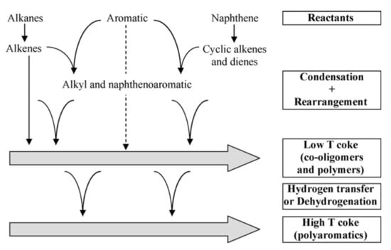 Over the years, intensive researches have been carried out to understand the mechanisms leading to the formation of complex coke molecules [,]. In reactions involving hydrocarbons, coke may be formed on both active sites and noncatalytic supports. Due to its important stability, coke formation is catalyzed by acid sites. As mentioned in the previous section, coke formation starts with the adsorption of coke precursors, typically olefins or light aromatics depending on the nature of the reactants. As reaction proceeds, these precursors will further react with other molecules. Coke formation involves many steps with intermolecular and intramolecular reactions. Distinction is made between low and high temperature coke. At low reaction temperatures (under 200 °C), mostly condensation and rearrangement reactions occur with the oligomerization of coke precursors. The resulting coke is mainly co-oligomers and polymers with high H/C ratios. This “light” coke formation is often reversible under specific operating conditions, making the concentration of condensation products limited by thermodynamic equilibrium. Therefore, in absence of reactant mixture, light coke molecules are retransformed to their initial compounds, referred to as “reversible coke”. At high temperatures (over 350 °C), carbonaceous molecules undergo additional reactions such as hydrogen transfer and dehydrogenation, leading to the formation of polyaromatic components. This “heavy” coke is much more difficult to remove because of its high stability and its imposing size, causing steric blockage. At intermediate temperatures, a mix of these different mechanisms is observed, as presented in Figure 9 []. Indeed, as coking proceeds, primarily formed light coke can undergo intramolecular condensation reactions. Carbocation intermediates that can be produced on catalyst acid sites can consequently form aromatics via dehydrogenation and cyclization reactions. These aromatics can then further react to polynuclear aromatics, which ultimately condense as coke molecules. The formation of polynuclear carbocations not only lead to the production of coke molecules but also are relatively stable, meaning they can sustain growth of molecules for quite long periods until a termination reaction occurs. At advanced coking stages, heavy polyaromatic structures are observed and can lead to both encapsulation and filamentous coke mechanisms as aforementioned.