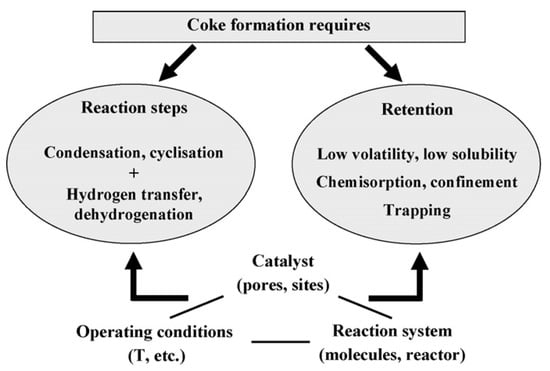 As coke precursors are often intermediates or desired products, coking appears as an inevitable phenomenon. All the different features of the reaction system have an impact by influencing the rate of the different possible reactions that reactants, intermediates, and by-products may undergo leading to coke formation. Deactivation studies for specific processes are usually carried out to study coke formation effects over catalytic activity loss, involved mechanisms and the influence of operating conditions in order to provide solutions to limit catalyst deactivation by coke deposition [].