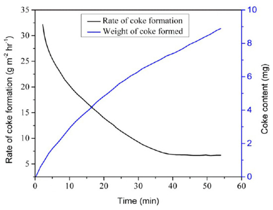 Rate of coke formation and weight content over steel cylinder during thermal cracking of ethane between 750 and 850 °C. Mahamulkar et al. [].