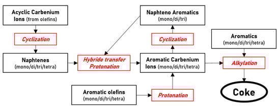Reaction scheme for coke formation during catalytic cracking of VGO. Adapted from Moustafa et al. []. Black: chemical compounds. Red: reaction mechanisms.