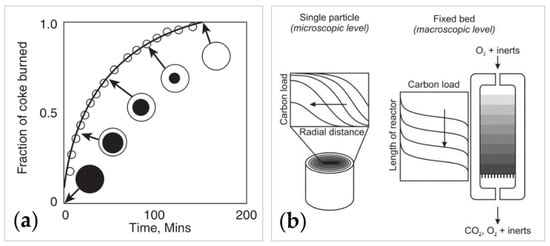 The evolution of reactivity is studied following the composition of oxidation products, especially the CO/CO2 ratio, to monitor which reaction is favored. Overall, coke oxidation mechanisms are governed by combustion temperature and coke nature: the more the coke is condensed and “heavy”, the more the temperature needs to be high for the oxygen to oxidize solid carbon compounds []. Coke location and therefore catalyst geometry are also determining parameters as they govern the diffusion of oxygen within catalyst pores and the accessibility of coke. The process of coke oxidation is consequently often qualified as a shape-selective process []. However, this problem is more related to mass transfer and diffusion limits than to reaction mechanisms and will be further developed in a following section (Section 3.1.2).