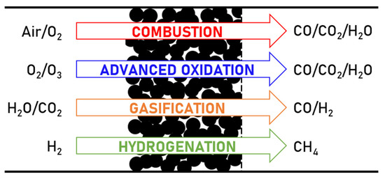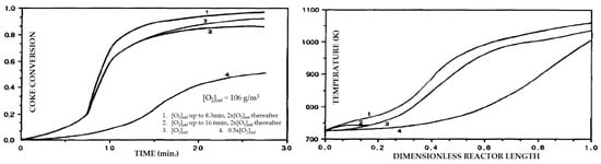 The most frequently used method to regenerate coked catalysts in the industry is coke combustion using air or oxygen. Spent catalysts are usually placed in a fixed-bed reactor and are treated with oxygen-containing gas at a high temperature. While nitrogen is mostly used as a diluent in laboratory-scale tests, steam is used in full-scale plant operations []. Coke removal reaction with air or oxygen is a rapid process occurring at moderate-high temperatures (usually around 400–500 °C). Coke combustion with oxygen is used for catalyst regeneration of common industrial processes such as cracking or catalytic reforming [,,].