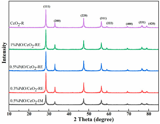 Figure 1 presents the XRD results of CeO2-R and Pd/CeO2 catalysts. The diffraction peaks assigned to cubic fluoride CeO2 crystal phase are observed in all the samples. Except for CeO2, there is no new diffraction peak related to Pd or PdOx species in the XRD pattern, owing to the low loading amount and high dispersion of Pd species. However, another possible reason may be that the Pd nanoparticles on the surface enter into CeO2 lattice to form PdxCe1−xO2−δ solid solution since the ionic radius of Pd2+ (0.97 Å) is smaller than that of Ce4+ (1.14 Å) [7,20]. In addition, both CeO2-R and Pd/CeO2 catalysts have similar grain size, indicating that the loading of Pd does not significantly change the grain size of CeO2-R. Figure S1 shows the nitrogen adsorption/desorption isotherm of the sample, by which the pore structure parameters can be measured. The mesopore structures in all samples can be evidenced by the typical IV adsorption isotherm with an H3-type hysteresis loop at relative pressures between 0.8 and 1.0. As shown in Table 1, the specific surface area of CeO2-R is 52.8 m2/g. When the Pd species are loaded, the specific surface area decreases obviously, which is mainly due to the pore blockage of CeO2-R by active Pd species. The specific surface area of 0.5% PdO/CeO2-RE is comparable to that of 1% PdO/CeO2-RE, indicating that there may be a dispersion threshold on the surface of CeO2-R, and higher Pd loading has a negligible effect on the dispersion.