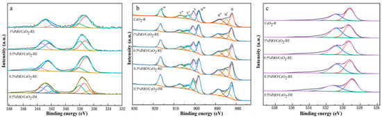 The Ce 3d XPS spectra of as-prepared samples are shown in Figure 5b, which can be deconvolved into 8 groups. The doublets labelled as (u‴, v‴) are the characteristic peaks of Ce3+, and the doublets denoted as (u, v), (u′, v′) and (u″, v″) are assigned to Ce4+. The content of Ce3+ on the surface can be calculated by the area ratio of Ce3+/(Ce3+ + Ce4+), it can be summarized from Table 2 that the content of Ce3+ increases after Pd loading, which may be linked to the strong interaction between Pd species and CeO2, according to the previous literature [25,26,27], the appearance of Ce3+ is associated with the oxygen vacancy on the surface of CeO2, 0.3% PdO/CeO2-RE has the highest concentration of Ce3+ (0.25), followed by 0.5% PdO/CeO2-RE (0.24), 0.5% PdO/CeO2-IM (0.19) and 0.3% PdO/CeO2-RE (0.18).