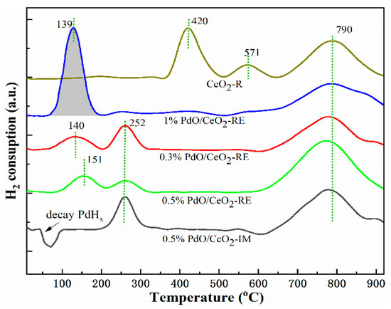 In the H2-TPR profile of 1% PdO/CeO2-RE, there is a reduction peak before 200 °C, corresponding to the reduction of PdO species, and the H2 consumption is 106 μmol/g, which is significantly higher than the theoretical value (91.5 μmol/g) calculated from the actual Pd content (0.89%). The remaining hydrogen consumption is due to the hydrogen spillover effect between Pd and CeO2-R, which also reflects the strong metal support interaction [31]. For the 0.3% PdO/CeO2-RE and 0.5% PdO/CeO2-RE, the reduction peaks of PdO shift to 140 °C and 151 °C, and the H2 consumption is 19 μmol/g and 24 μmol/g, respectively, indicating that there are more PdO species in 0.5% PdO/CeO2-RE. However, the reduction peak at 252 °C can be considered to be the co-reduction peak of Pd species and lattice oxygen in PdxCe1−xO2−δ phase. However, unlike the catalyst prepared via the reduction-deposition method, 0.5% PdO/CeO2-IM has a negative peak before 100 °C, which is associated with the decomposition of Pd hydride phase. The appearance of Pd species on the surface is also evidenced by the above XPS results. Similarly, the high-temperature region peaks around 790 °C of all the Pd/CeO2 catalysts correspond to the reduction of bulk CeO2 hardly coupling with Pd species. Combined with the above analysis, highly dispersed Pd species loaded on the surface of CeO2 can significantly enhance the oxygen mobility of the carrier, so as to boost the catalytic oxidation of CH4.