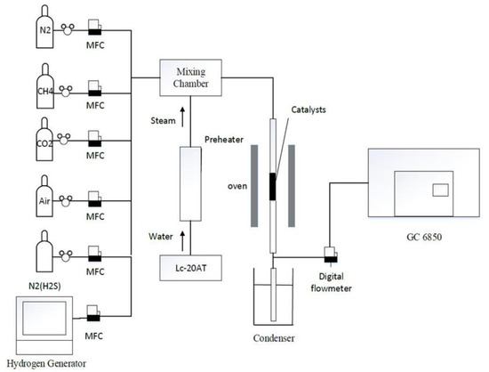 Based on our previous studies [15,25], the good catalytic ability and thermal stability of DRM can be resulted by using the Ni-Ce/Al2O3 catalysts. To focus on the effect of the H2S-poisoned DRM performance, 20 wt%Ni-5 wt%CeO2/Al2O3 was adopted in this study. Detailed preparation and characterization of the catalyst can be found in our previous studies [15,25]. More detailed characterizations for the catalysts before and after use, such as TEM, TGA, and XPS, have been reported extensively in the literature [18,26,27,28].