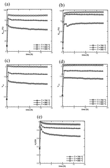 Figure 2 shows the effect of reaction temperature on the DRM performance without the H2S effect for the CH4/CO2 = 1/1 case. The experimental data shown in Figure 2 were taken when the reaction temperature reached the designated value, and the data collection lasted for 18 h. For every 15 min, the data from the experiment were reported. Due to endothermic reaction, it can be seen that the DRM performance is enhanced as the reaction temperature increases. The thermally stable results of the CH4 conversion, CO2 conversion, H2 yield, and CO yield, as shown in Figure 2a–d, can be obtained when the reaction time increases for T = 800 and 900 °C. For T = 700 °C, a slight decrease in the DRM performance can be found. Since there is no H2S effect, the decrease in the DRM performance is mainly due to the catalyst deactivation from the carbon deposition. By comparing the CH4 and CO2 conversions shown in Figure 2a,b, one can see that CO2 conversion is higher than the CH4 conversion for the three reaction temperatures studied. From the theoretical background, this is apparently due to the contribution from RWGS in which CO2 reacted with H2 to form CO and H2O. In Figure 2c,d, the H2 and CO yields are shown. The variations of the H2 and CO yields are similar to those of XCH4 and XCO2. Additionally, based on the thermodynamic background, the theoretical maximum yields of H2 and CO would be 2. As shown in Figure 2c,d, the yields of H2 and CO exceed 2 slightly for the T = 900 °C case due to the uncertainty of the experimental measurements. From the theoretical background, the H2/CO ratio has a value of unity. Figure 2e shows the H2/CO ratio based on the results shown in Figure 2c,d. H2/CO is less than unified due to the consumption of H2 and the formation of CO in the RWGS reaction. As noted above, the DRM reaction is the dominant reaction at high reaction temperatures. The H2 and CO yields follow the similar variation trend of XCH4. In the following discussions, only XCH4 and XCO2 are reported.
