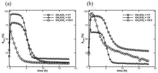 In Figure 4, the effect of the CO2 amount on the H2S-poisoned DRM performance is shown for reaction temperature T = 800 °C. For the higher CO2 amount case, i.e., CH4/CO2 = 1/2, the DRM performance follows the same trend as the CH4/CO2 = 1/1 case discussed above. From the thermodynamic analysis, carbon formulation can be enhanced by reducing the CO2 amount in the DRM [35,36]. For the CH4/CO2 = 1/0.5 case, due to more carbon formulations, it can be seen that the variation trend of XCH4 is different from the CH4/CO2 = 1/1 and 1/2 cases. It is seen that CH4 conversion drops immediately in the early reaction time and then reaches a steady-state value. As compared with the CH4/CO2 = 1/1 and 1/2 cases, the initial drop in XCH4 is due to catalyst deactivation caused by both carbon deposition and sulfur poison. It is noted that the XCH4 can be enhanced by increasing the CH4/CO2 ratio for both the non-poisoned and poisoned catalysts shown in Figure 4a.