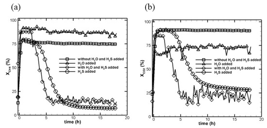 The poisoning effect is always correlated with the H2S concentration contained in the reactant. Based on the studies by Ashrafi et al. [26] and Yang [27], the magnitude of the H2S concentration contained in the reactant affects the speed of the stabilization of the catalyst activity, and the phenomenon of catalyst deactivation is similar for different H2S concentrations. Based on these studies, a single H2S concentration with a value of 100 ppm was chosen in this study.