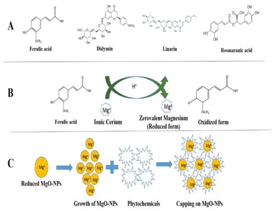 Mechanistic approach for synthesis of MgO-NPs using aqueous extract of Mentha arvensis. (A) The structural and chemical formulas of Ferulic acid, Didymin, Linarin, Rosmaranic acid these all compounds are present in Mentha arvensis extract. (B) Ferulic acid interacts with magnesium ion and reduced it to Mg+1 to Mg0. (C) Reduced form of magnesium nanoparticles and phytochemicals that are taking part in in capping o magnesium nanoparticles.
