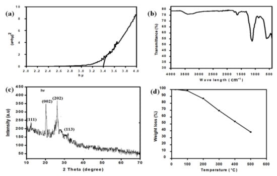 (a) Optical Band gap, (b) FTIR spectrum, (c) XRD representation and (d) TGA analysis of Biosynthesized MgO-NPs.