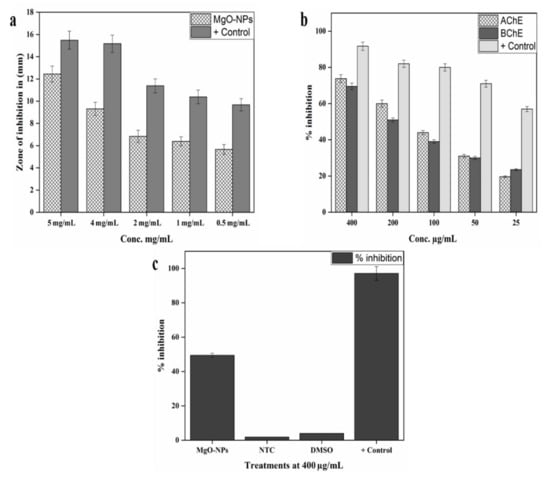 Alzheimer’s is a neurodegenerative disease and worldwide accounts for sixty to 80 percent cases of dementia. This disease occurrence is alarming, with one person developing Alzheimer’s disease every 65 s in the United States alone []. Cholinesterase inhibitors are currently available for patients at any stage of Alzheimer’s disease. The successful inhibition of cholinesterase enzymes has been identified using a variety of synthetic and natural substances. Hydrolysis of acetyl choline to choline and acetic acid in synapsis in tissues and neuromuscular junctions is catalyzed by these enzymes. Reduced acetyl choline levels contribute to the development of Alzheimer’s disease. acetylcholinesterase (AChE) and butrylcholineterase (BChE) inhibition was investigated using different concentrations of plant extracts []. The inhibition of esterases by MgO-NPs was dosage dependent. MgO-NPs were most potent at 400 µg/mL, inhibiting AChE by 73.82 ± 2.19 percent and BChE by 69.50 ± 1.82 percent. At 25 µg/mL, AChE had a 19.63 ± 0.47% inhibition response and BChE had a 23.53 ± 0.51% inhibition response. Overall, as seen by the values in Figure 5b, NPs is found to be highly active against both enzymes. Our findings are consistent with previous research [,].