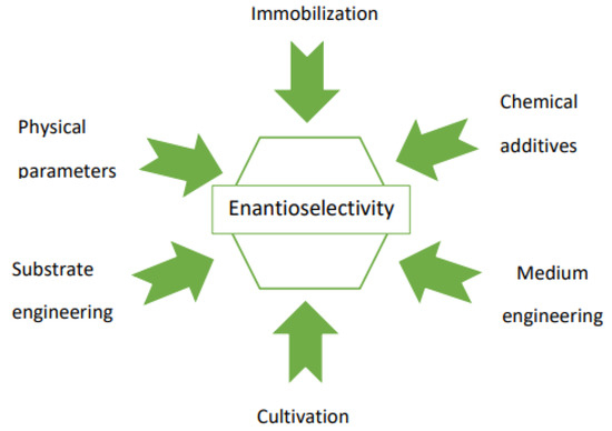 | Biocatalyst cultivation under different conditions | Possible activation of different groups of enzymes with the desired activity and enantioselectivity. Starvation conditions may trigger alternative metabolic paths and modes of transport across the cell membrane | Improperly selected conditions can lead to reductions in selectivity and even cell death | Kinetic resolution of racemic aminophosphonate based on oxidase activity preceded by a pre-incubation stage under starvation conditions | [14,15,16,17] |