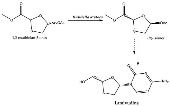 - Chen, Y.; Zhang, X.; Zheng, G.; Gao, S. Preparation of the enantiomerically enriched precursor of lamivudine (3TC™) via asymmetric catalysis mediated by Klebsiella oxytoca. Process. Biochem. 2019, 81, 77–84. [Google Scholar] [CrossRef]