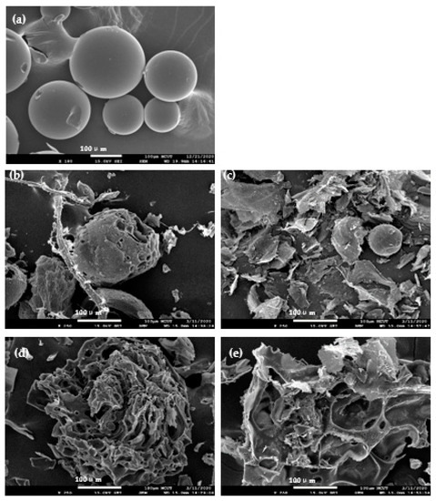 The appearance of raw phenolic resin waste was observed using field-emission scanning electron microscopy (FE-SEM) and illustrated in Figure 1a; the waste was composed of spherical particles, each having a 50–300-μm diameter almost nonporous surface. The carbon activated with H3PO4 (denoted by subscript P; Figure 1b,c) exhibited less porosity than activated with KOH (denoted by subscript K; Figure 1d,e). Compared with the relatively full spheres with deep pores on the surface of microwave-catalyzed AC (Figure 1b,d), that prepared through EH exhibited a more fractured structure (Figure 1c,e). With KOH activation, microwave carbonization resulted in AC with finer pores (Figure 1d), which contrasted the AC surficial hollow diameter of approximately up to 50 μm that EH carbonization produced (Figure 1e).