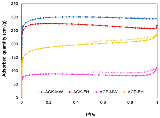 Figure 2 displays the N2 adsorption–desorption isotherms of AC measured at 77 K. According to the International Union of Pure and Applied Chemistry classification [22], the isotherms of KOH-AC (KOH activated AC, i.e., ACK-MW and ACK-EH) are Type I, which is characteristic of microporous materials having low external surface [22]. Therefore, the uptake of adsorbate (nitrogen in the test) was mainly fulfilled with the micropore filling, distinct from the surface coverage on the walls of open macropores or mesopores [23,24]. Consequently, this isotherm type has a limited adsorption capacity, governed by the accessible micropore volume rather than by the internal surface area [22,25]. A steep uptake at extremely low values of p/p0 is due to increased adsorbent–adsorptive interactions in the narrow micropores. In contrast to the reversible isotherm (in which the adsorption and desorption branches almost overlap) observed for KOH-AC, H3PO4-AC exhibited hysteresis loops, which can be attributed to adsorption metastability with respect to the same adsorbate exhibiting on a plane surface or network effects that often occur if wide pores are having narrow necks [22]. The H4-type hysteresis loop, normally associated with slit-shaped pores, was also observed for ACP-MW and ACP-EH. The H4 loop is normally characterized by a nonrigid aggregation of plate-like particles or generally observed with complex materials containing mixed pore sizes [22,26]. The adsorption branch of the ACP-MW and ACP-EH isotherms revealed a composite of Type I and II isotherms corresponding to a mixed microporous and mesoporous structure because a substantial amount of N2 was adsorbed under all pressures. The adsorption increasing without limit at p/p0 = 1 observed on the H3PO4-AC (ACP-MW and ACP-EH) was due to the unrestricted adsorption of multilayers typical of Type II isotherms.