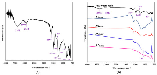 Figure 3 displays the major absorption peaks of the Fourier transform infrared spectra of the raw resin waste and prepared AC. As Figure 3a reveals, the peak was at 3375 cm−1, corresponding to phenolic and alcohol -OH stretch vibrations, which is consistent with the literature [27,28]. This peak weakened and shifted to higher wavelengths in the AC produced through EH carbonization, regardless of the activator used. This peak shift could be due to cross-linking between phenol and its derivatives [29,30]. During microwave carbonization, the absorption peak at 3375 cm−1 almost faded away. The peaks at 1206 cm−1 indicated alkyl–phenol C–O stretch vibration, and 1607 cm−1 indicated C = C aromatic ring stretch vibration remained during EH carbonization despite weakening considerably under microwave radiation. Moreover, the KOH-AC exhibited more pronounced weakening of its absorption peaks than did the H3PO4-AC under the same carbonization conditions, demonstrating that KOH reacts more strongly with phenolic resin than H3PO4 does. The peak at 3005 cm−1 indicated the aromatic C–H stretch vibration and the peak at 1106 cm−1 indicated the aromatic C–H in-plane deformation vibration weakened in the AC produced through EH but almost disappeared in microwaved AC. The weakening or disappearance of the intensity peak of phenolic and alcohol -OH stretch vibrations, alkyl–phenol C–O stretch vibrations, aromatic C–H stretch vibrations, and aromatic C–H in-plane deformation vibrations implied that the microwaves catalyzed the phenolic compound reaction or volatilization, consequently enhancing carbonization. Moreover, the peak at 1077 cm−1 indicated that polycyclic aromatic ring deformation vibration appeared in the microwaved AC (ACP-MW and ACK-MW) but not in the electric heated AC, supporting the notion that the microwaves enhanced carbonization.