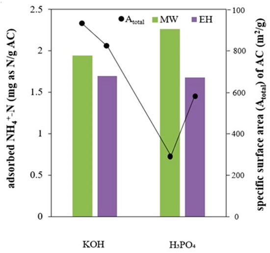 Ammonium (NH4+) adsorption onto activated carbon (AC) at pH 6.0 ± 0.05 for 24 h. The left Y-axis indicates ammonium adsorption in milligrams of N per gram of AC, and the right Y-axis is the specific surface area of AC. EH: electric heating; MW: microwave radiation.