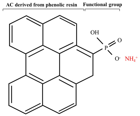 Figure 5 schematically presents the phosphate-functionalized structure on the H3PO4-AC. The surface phosphate functional groups on the ACP-MW and ACP-EH also explain the highly effective ammonium adsorption of the H3PO4-AC, even at low specific surface areas, because of the strong, complex formation of phosphate and ammonium (Figure 5). The formation of phosphate complexes on the phenolic resin surface might have blocked the pores or formed a passive film on the resin surface that restricts porosity development, possibly leading to the lower specific surface area of the ACP-MW.