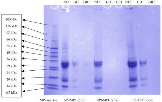 The SDS-PAGE profile of the protein blends before and after SGID is displayed in Figure 2. In the case of the blends, the bands associated with the CNs (19–25 kDa for α-, β- and κ-CN), α-la (~14 kDa) and β-lg (~18 kDa) from MPC were visible. The SPI–MPC blend also displayed two major bands at approx. 37 kDa and 40 kDa. These represent the acidic subunits of glycinin. In addition, the 2S storage proteins present in SPI–MPC were visible with MWs of 12–15 kDa. The lane containing the PPI–MPC blend had a band at ~38 kDa. This probably represents legumin, a hexameric protein, which is normally separated into two subunit polypeptides (α = acidic 38–40 kDa and β = basic 19–22 kDa) when S–S bonds are broken under reducing conditions []. In the case of the RPI–MPC 50:50 bands, the MPC proteins were less intense as the proportion of MPC in this blend was lower than in the two other blends. A CN band appeared in the RPI–MPC blend lane. Similarly, the prolamins observed at 13–16 kDa were separated in the RPI–MPC blends. However, no other bands could be readily distinguished in the RPI–MPC blend.