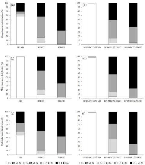 Molecular mass distribution profiles of SPI (a) and SPI–MPC 25:75 blend (b); RPI (c) and RPI–MPC 50:50 blend (d); and PPI (e) and PPI–MPC 25:75 blend (f), before and after simulated gastric and gastro-intestinal digestion. SPI, PPI, RPI and MPC represent soy, pea and rice protein isolate and milk protein concentrate, respectively. ND, GD and GID represent non-, gastro- and gastro-intestinal digested, respectively.