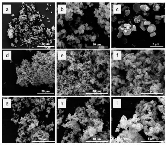 SEM images of MIL125-(Ti): (a–c), MT-500 (d–f) and MT-600 (g–i) at different magnifications.