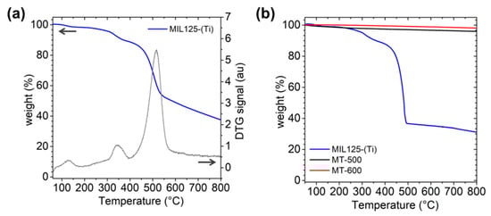 (a) TGA profile of MIL125-(Ti) in inert atmosphere (N2) along the DTG signal; (b) TGA profiles of MIL125-(Ti), MT-500 and MT-600 in air.