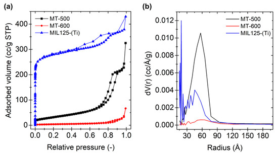 (a) N2 adsorption isotherms of MIL125-(Ti), MT-500, and MT-600 at 77 K; (b) Pore size distributions of MIL125-(Ti), MT-500, and MT-600 estimated by applying the BJH model.