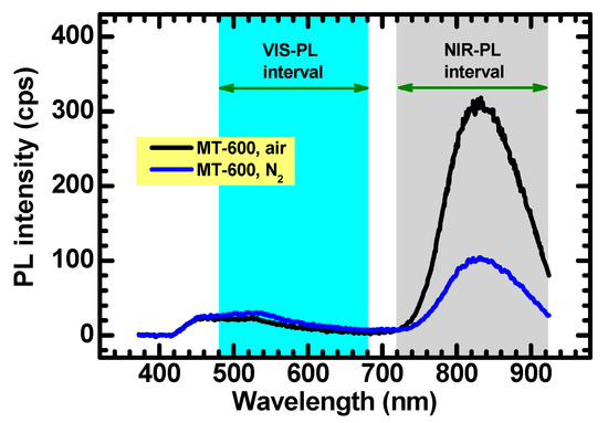 PL spectra of the MT-600 sample acquired in air (black curve) after 20 min exposure to flowing N2 (300 sccm flow): The spectra are acquired at room temperature. The wavelength interval used as definition for “VIS-PL” and “NIR-PL” are highlighted.