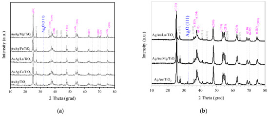 Figure 1 shows the X-ray diffraction (XRD) diffractograms of selected samples. Besides the narrow diffraction lines corresponding to the support (anatase—gray color; rutile—pink color), the peak of Ag2O (blue color) was detected for AuAg supported on TiO2 and Ce/TiO2, and for AgAu supported on TiO2 and Mg/TiO2, with crystallite sizes of around 5–8 nm. According to the catalyst preparation method (see Materials and Methods), silver should be deposited as Ag2O. The fact that only AuAg/TiO2, AuAg/Ce/TiO2, AgAu/TiO2 and AgAu/Mg/TiO2 showed a crystalline phase of silver oxide while the Ag contents in these samples had no significant difference as compared with the others (Table S1) might be due to the metal–support interaction features during synthesis (stabilization of Ag2O particles). The absence of the peaks of gold-containing phases suggests either a non-crystal structure of gold and/or the existence of Au species with a size below 1–2 nm. The absence of well-defined lines corresponding to the support modifiers shows that they are highly dispersed on the TiO2 surface.