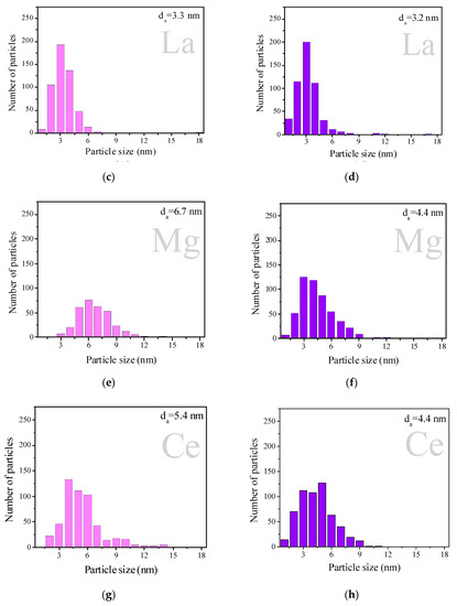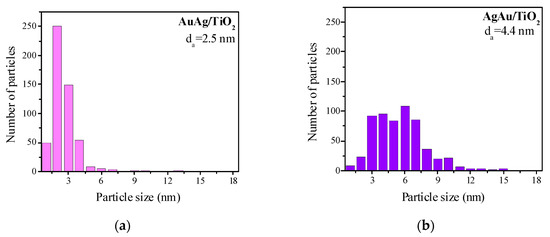 Figure 2 displays the particle size distribution obtained from high-resolution transmission electron microscopy (HRTEM) images (Figure S1) of the H2-reduced samples. AuAg samples are represented as pink histograms and AgAu samples as purple ones. All the studied samples were characterized by a broad distribution of particle sizes, the majority within the 1–10 nm interval. It is interesting to note that AuAg supported on unmodified TiO2 showed the narrowest particle size distribution and the smallest average particle size of 2.5 nm, while AuAg on modified supports showed broader particle size distributions. Regarding the AgAu series, TiO2 support modification with Ce and Mg did not show any effect on the particle size distribution: for AgAu/TiO2 (Figure 2b), AgAu/Mg/TiO2 (Figure 2f) and AgAu/Ce/TiO2 (Figure 2h), the average size was 4.4 nm and the particle size distribution interval was 1–6 nm. La and Fe as modifiers of TiO2 in the AgAu series made the particle size distribution narrower than on unmodified titania. Both AgAu and AuAg on TiO2 modified with La demonstrated close average sizes (3.2 and 3.3 nm, respectively) and a similar interval of the size distribution (1–6 nm), which might mean that the deposition order (AuAg or AgAu) is not important for La/TiO2. Analyzing both the XRD and HRTEM results allowed us to conclude that relatively large (2.5–6.7 nm) unstructured particles were formed for both deposition orders.