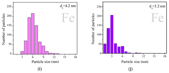 Particles size distribution of AuAg (pink) and AgAu (purple) catalysts on different supports: TiO2 (a,b), La/TiO2 (c,d), Mg/TiO2 (e,f), Ce/TiO2 (g,h) and Fe/TiO2 (i,j). Samples were studied after reduction in H2 at 300 °C for 1 h. Some previously reported results concerning AuAg samples are included for comparison, reprinted from [44] (copyright 2017), with permission from EUREKA SCIENCE.
