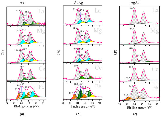 X-ray photoelectron spectroscopy (XPS) was applied to investigate the electronic states of the gold surface. Figure 4 shows the results of the Au (Figure 4a), AuAg (Figure 4b) and AgAu samples (Figure 4c). The interpretation of the XPS data based on the literature [64,65,66,67,68] is presented in Table 1. The XPS peaks corresponding to possible oxidation states overlap, and thus the peaks must be resolved by fitting. The results presented represent one solution for resolving the peaks, and the true oxidation states may be different.