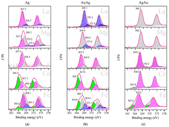 Figure 5 shows the XPS spectra of the Ag 3d5/2 lines of the Ag (Figure 5a), AuAg (Figure 5b) and AgAu (Figure 5c) samples. The interpretation of the spectra made in accordance with the literature data [69,70,71] is shown in Table 2.