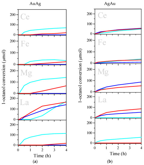 Figure 6 shows the results of the catalytic tests of 1-octanol oxidation for AuAg (Figure 6a) and AgAu catalysts (Figure 6b) supported on pristine and modified TiO2 after different redox pretreatments. AuAg/La/TiO2 was the most active catalyst for all kinds of pretreatment. In both groups, AuAg and AgAu, the catalytic activity decreased in the following support order: La/TiO2 ≥ Mg/TiO2 > TiO2 > Ce/TiO2 ≥ Fe/TiO2. Concerning the influence of pretreatment, for the AuAg series, the pretreatment drastically affected the catalytic activity. In most cases, H2 pretreatment almost completely suppressed the catalytic activity of the samples (except for the La-modified one). O2 pretreatment also reduced the activity but not to the same extent. For the samples with the other order of metal deposition (AgAu), the opposite effects were observed. In most cases, pretreatments had little effect on the activity of the catalysts or slightly increased it.
