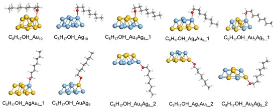 Optimized structures of C8H17OH_AuxAgy (x + y = 10) complexes.