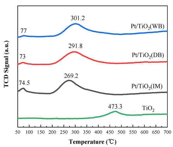 Figure 6 shows the H2-TPR profiles of pure TiO2 and the three Pt/TiO2 catalysts prepared by different methods. For pure TiO2, only one reduction peak at 473.3 °C is visible, which is ascribed to the reduction of the superficial lattice oxygen of TiO2 [34,35]. The H2-TPR profiles of the Pt/TiO2 catalysts also show a second reduction peak between 70 and 80 °C, which could be attributed to the reduction process of PtO into metallic Pt [36,37]. Additionally, when Pt was loaded on TiO2, the reduction peak of the superficial lattice oxygen of TiO2 moved to lower temperatures, shifting from 473.3 °C to that between 200 and 350 °C. The intensity of the peak, representing the consumption of H2, also significantly increased for Pt/TiO2 compared with pure TiO2. This phenomenon was caused by hydrogen overflow [38], and the results showed that loading Pt on TiO2 increased the surface oxygen content. Comparing the reduction peaks located between 200 and 350 °C, it can be seen that Pt/TiO2(IM) had the lowest reduction temperature, followed by Pt/TiO2(DB) and then Pt/TiO2(WB). These results are a strong indication that Pt/TiO2(IM) had the best low-temperature catalytic activity, which is consistent with the results of the catalyst activity tests shown in Figure 1.