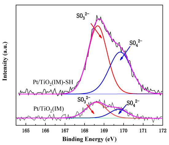 The XPS spectra of the S2p core level region in the Pt/TiO2(IM) and Pt/TiO2(IM)-SH catalysts are shown in Figure 8. SO42− and SO32− peaks appear for both the fresh and poisoned catalysts. The SOX2− peaks in the spectrum of Pt/TiO2(IM) originated from impurities in the TiO2 carrier. The intensity of these peaks in the spectrum of Pt/TiO2(IM)-SH significantly increased compared with the fresh catalyst spectrum, an indication of a much higher surface concentration of SO42− and SO32−. This further verified the poisoning mechanism for Pt/TiO2 catalysts in the presence of SO2. The catalyst was poisoned but not deactivated. The reason may be as follows: SO2 could inhibit the catalytic oxidation of CO, but H2O could enhance the catalytic oxidation of CO. The promoting effect of H2O was greater than the inhibiting effect of SO2 in the presence of SO2 and water vapor, so as the test progressed, the amount of sulfate on Pt/TiO2 did not continue to increase.