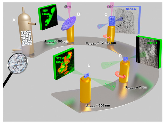 The complex structure of SCALMS on different length scales with its porous support and active sites embedded in Ga requires a correlative 3D microscopy approach. The focus of previous SCALMS studies was set primarily on a detailed analysis of the catalytic properties [9,10,16]. In this study, we present a comprehensive and in-depth structural and analytical characterization of a Ga-Pd SCALMS system in the as-prepared state. Thus, the sample system was not yet exposed to the conditions in the catalytic reactor. We developed a correlative workflow by combining lab nano-CT, 360°-ET, transmission electron microscopy (TEM) and energy-dispersive X-ray spectroscopy (EDXS) tailored to characterize the complex and scale-bridging structure of novel SCALMS systems (Figure 1). This comprehensive material’s characterization helps to further unravel and understand the underlying mechanisms and structural peculiarities leading to the reported superior catalytic performance.