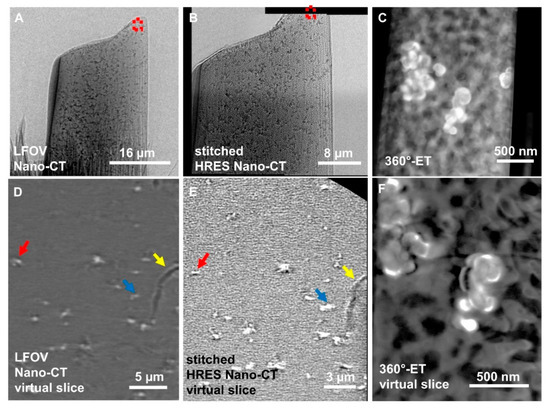 Firstly, we compare the LFOV-PC nano-CT, stitched-HRES-PC nano-CT and 360°-ET reconstructions regarding their capability to resolve Ga-Pd droplets in the porous glass network. The FIB-prepared SCALMS pillars of different size and diameter (Table 1) were reconstructed from LFOV nano-CT (Figure 3A), HRES nano-CT (Figure 3B after the stitching process) and 360°-ET (Figure 3C) tilt series. Corresponding virtual slices of the volume renderings are depicted in Figure 3D–F. The complete tilt series, animated slicings through the reconstructed volumes and volume renderings (maximum intensity rendering) of sample routines 1 and 2 are provided as Videos S1–S12.