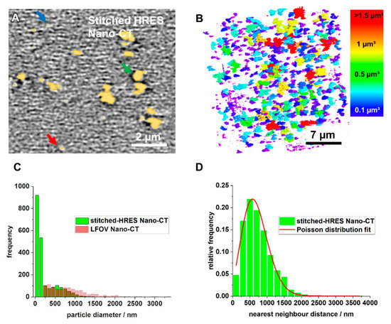 Several approaches for scale-bridging 3D analysis have been demonstrated. For instance, a semidestructive workflow combining nano-CT with FIB-SEM tomography enabled a superior segmentation of 3D datasets and thorough analysis of samples of several microns in size [39,40]. As a nondestructive approach, the combination of 360°-ET and nano-CT proved to reliably reveal the structure of complex material systems [41,42], e.g., macroporous zeolite particle agglomerates, with nm resolution, while, at the same time, covering decently sized volumes up to (40 µm)³, enabling the acquisition of statistically relevant information [43].