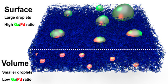 SEM imaging and SEM-EDX contribute important findings on the larger scale when investigating extended surface areas of the SCALMS primary particles. The surface Ga-Pd droplets are much larger than the embedded particles and, in contrast to the latter, consist of mainly Ga. Since our findings allow a clear assignment of Ga-Pd droplets to different classes with respect to their location, size and chemical composition, the existing SCALMS model might require reconsideration. The SCALMS model according to Taccardi et al. [9] proposes that the high catalytic activity and resistance to coke formation have their cause in the mobility of the Pd atoms in the liquid Ga volume, assuming the structural similarity of all Ga-Pd droplets. An adjusted structural model is illustrated in Figure 9. On the surface, large and Ga-rich droplets are present, whereas smaller droplets with strongly increased Pd content (or much lower Ga/Pd ratio) occur inside the volume. How this bimodal particle distribution in size and composition evolves during synthesis and whether or not it is sustained during the operation conditions of the catalytic alkane dehydrogenation (i.e., with reaction temperatures > 450 °C) are important questions which have to be addressed in subsequent studies. We emphasize here that the melting temperature and the relative amount of intermetallic phase and liquid Ga-Pd at temperatures below the liquidus line sensitively depend on the Ga/Pd ratio in a single droplet [12].
