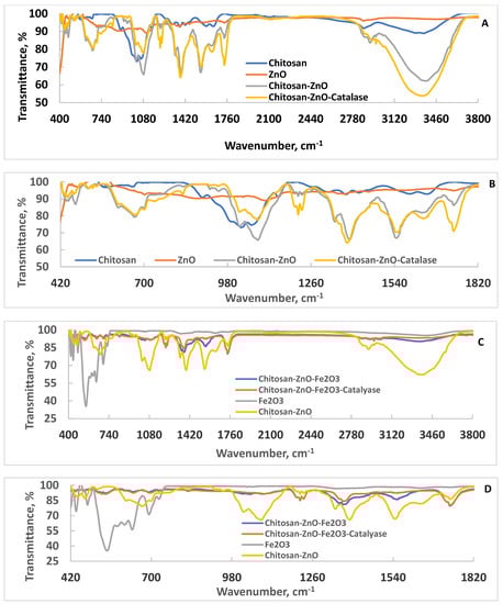 ATR–FTIR spectra of chitosan, ZnO, chitosan–ZnO, and chitosan–ZnO–catalase ((A), full scale; (B), expanded region), and ATR–FTIR of chitosan–ZnO–Fe2O3, chitosan–ZnO–Fe2O3–catalase, Fe2O3, and chitosan–ZnO ((C), full scale; (D), expanded region).
