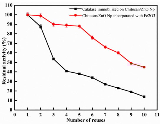 Reuse of immobilized catalase on CS/ZnO and CS/ZnO/Fe2O3 (means ± S.E, n = 3).